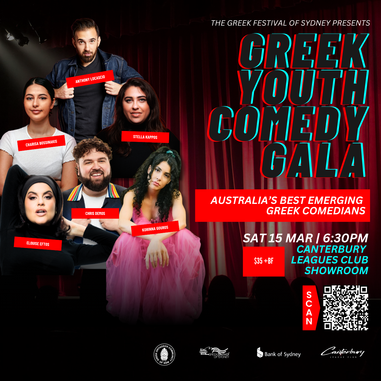 A showcase of the country’s brightest up and coming comedians of Greek origin, brought together for a night of laughs exclusive to the Greek Festival of Sydney. Join Anthony Locascio and his fellow standup comedians, for an unforgettable night. Anthony is one of the country’s most in demand comics, having toured internationally across 2024, including New York and London, and selling out multiple years at the Sydney and Melbourne Comedy Festivals. He will be accompanied by actor, singer, dancer and one of Australia’s most electrifying new comedians, with a truly unique style, Elousie Eftos, actor, writer and comedian Korinna Gouros and fellow acclaimed comedians Chris Demos, Stella Kappos and Charisa Bosinakis.