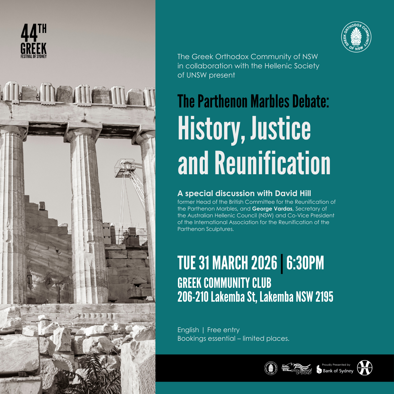 Join David Hill, former head of the British Committee for the Reunification of the Parthenon Marbles, who has campaigned for decades for the return of the sculptures to Athens, Greece. He will be joined by George Vardas, Secretary of the Australian Hellenic Council (NSW) and Co-Vice President of the International Association for the Reunification of the Parthenon Sculptures.